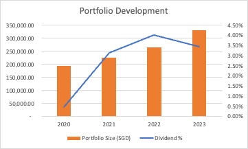 那回到股票, 2023年股票组合有了很大 增长, 跟2022年比起来, 从收入储存进去的组合达到了SGD75k。 把总资产提升到SGD 330k. 当然,这有很大的一部分是因为橱窗的效应,因为在2023年我的产托的组合遭受到相当大的冲击。
